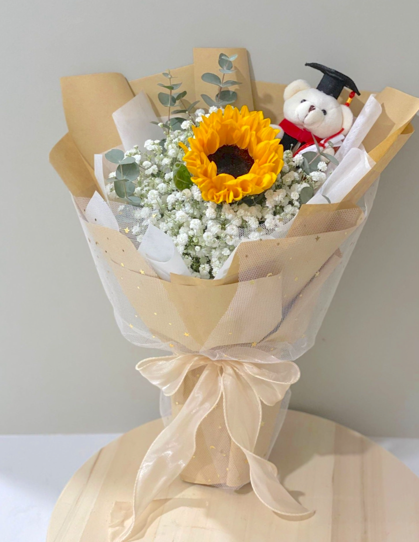 Flowers in bouquet: 1 Sunflower, Baby's Breath, and Foliage.