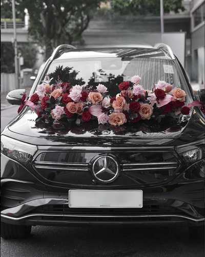 This wedding car flower is tailored for vehicle with bigger front bodies, offering propotionate and striking look. Available in different colour themes to suit your wedding theme and style. Crafted with lush blooms, this design ensure perfect fit for large-bodied wedding cars, transforming your ride into a moving centerpiece.
